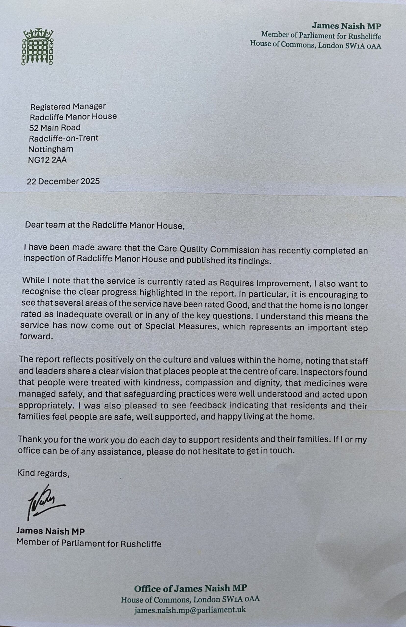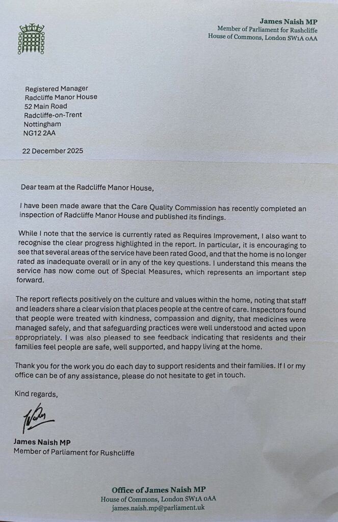 The New Year has started with us receiving a personal letter (see below) from our MP, James Naish! In his letter he acknowledges the difficulties that the Home has been through over the last 6 months but comments very positively on our most recent inspection. His remarks about the ‘culture and values’ we have at the Home are particularly pleasing feedback for Michelle and everyone that works at the Home.